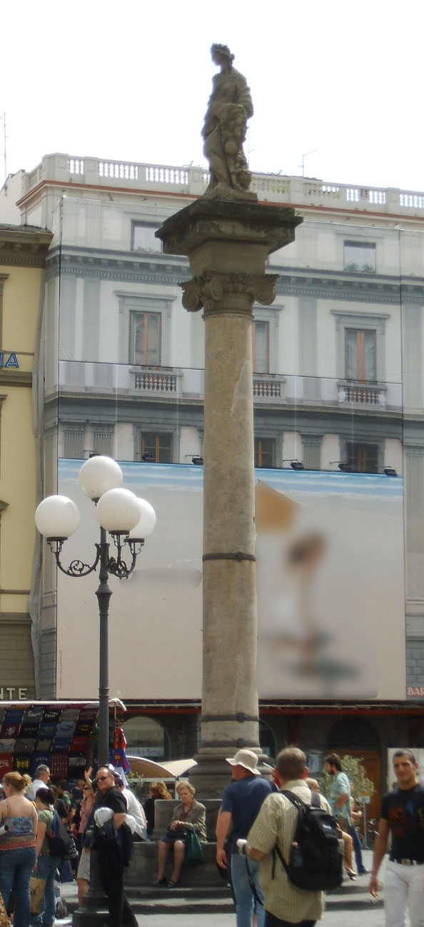 The original Roman column was destroyed in the fifteenth century and in 1431 and replaced by a new one, surmounted by a statue of Donatello: a female figure holding a cornucopia symbol of prosperity and luck.