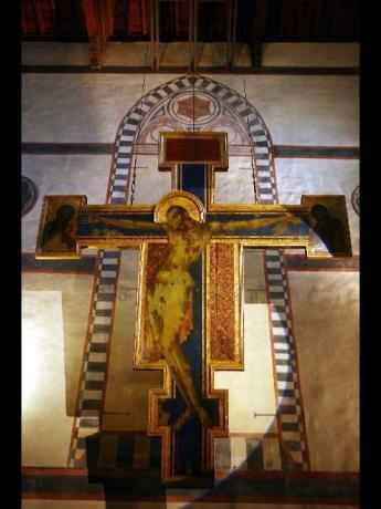 The painted crucifix, executed in 1280, came to heightened fame when muddy waters, which swelled the banks of the Arno and inundated the entire city, swept into the church and wiped most of the paint off.