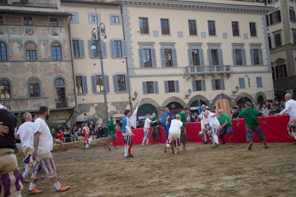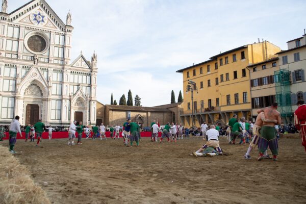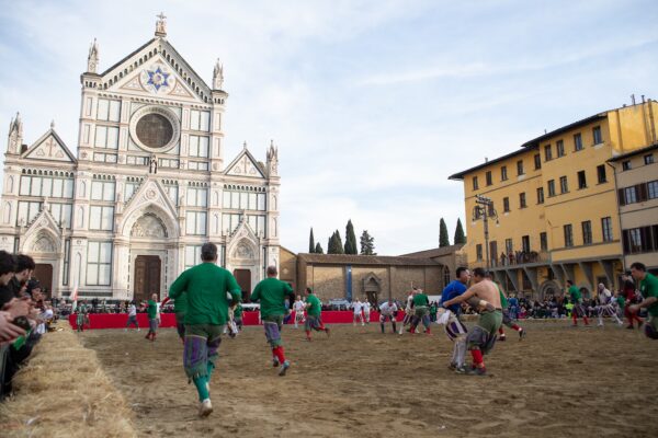 Before the match, a delegation of players, flag bearers, and musicians from the Historical Football Parade, all dressed in Renaissance attire, gathered inside the Basilica of Santa Croce to receive a blessing from the rector. Following this solemn moment, the group returned to the square for a spectacular performance by the city’s flag-throwers, setting the stage for the highly anticipated match, which kicked off at 3:30 PM.