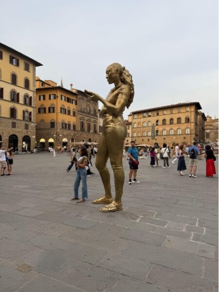Tourists, too, had varied reactions. A trio from Salamanca, Spain—Jorge Rodríguez Niño, 24; Samuel Martínez Santos, 23; and Javier Mateo García, 22—called the statue “ugly.” For them, it didn’t fit the visual or cultural tone of the piazza. “She looks more modern, creating more contrast,” one said. The consensus? “No, it doesn’t fit in with Florentine culture.”