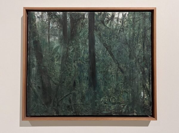 The rooms are filled with the aroma of fresh paint. White walls hold small, picturesque works that transport visitors to the forests they portray. Pops of green and stem-shaped drawings encourage viewers to sit, observe, and rethink land conservation. Spread across four rooms, the exhibition creates a layered sensory journey. The first three spaces are bright with big white walls featuring small-scale paintings, charcoal works on canvas, and pages from Mellin’ssketchbooks. Each piece reflects her fieldwork-based practice art created while immersed in nature, from Australia to the rainforests of Peru.