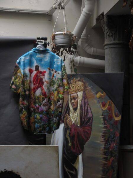 Banned From TV by N.O.R.E. blasts full volume as the scent of dried paint, easel wood, and linen drifts around the bone-white room, sunlight streaming through the glass ceiling and bouncing off the glossy black tile floor. A smear of crimson comes alive on canvas as Thelonious Stokes, 30, paints a drop of blood rolling down his subject’s cheek from a crown of thorns, almost resembling a tear.