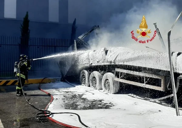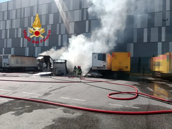 The blaze erupted in a parking area on via Tevere, where three semi-trailers parked in the lot caught fire and were completely engulfed in flames. Witnesses reported hearing loud explosions, likely caused by the bursting of the trucks’ tires. The sounds were clearly heard throughout the surrounding neighborhoods.