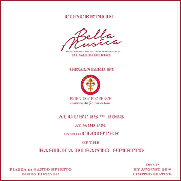 Friends of Florence, the non-profit behind the event, has long supported the preservation of Florence’s cultural treasures. In the Basilica di Santo Spirito alone, the organization has funded the restoration of masterpieces such as Filippino Lippi’s Neerli Altarpiece, Pietro del Donzello’s Annunciation, two paintings by Alessandro Allori, the Incoronation of the Virginby Giovanni Maria Butteri, and the repositioning of Michelangelo’s Crucifix in the Sacristy.