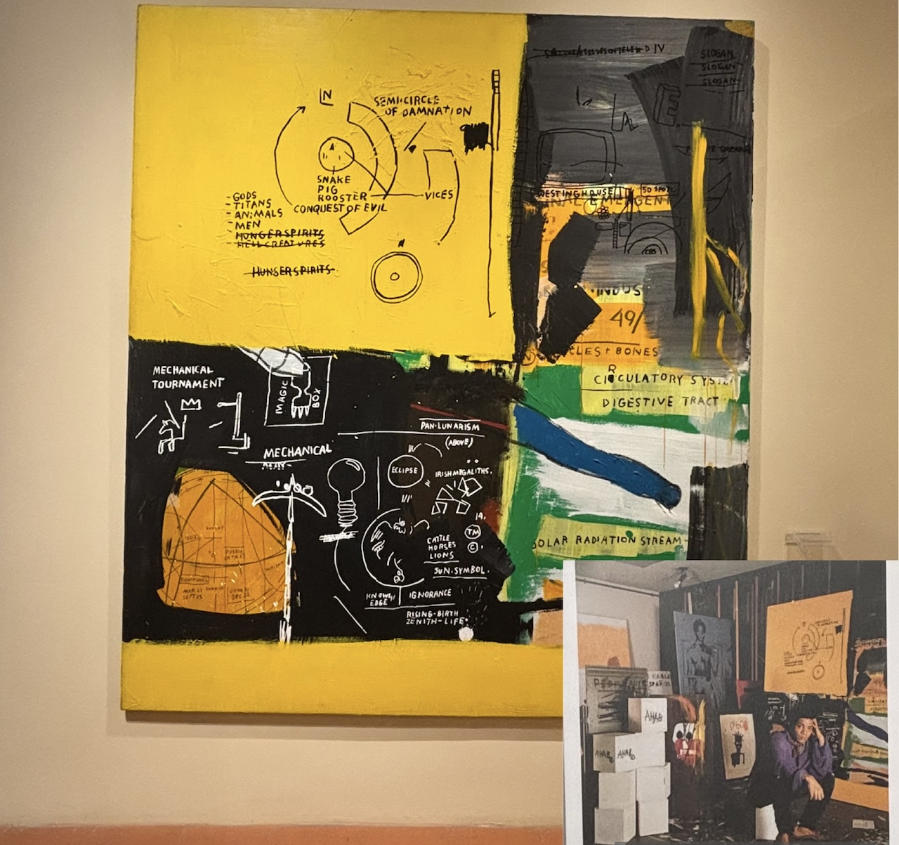 The climax of the exhibition is the Pop Art section, where the energy of the late 20th century bursts into vivid colors and bold forms. If Arte Povera had reacted to industrial alienation and Land Art had looked to nature, Pop Art responded to the explosion of mass media, consumerism, and popular culture. Jean-Michel Basquiat’s frenetic compositions, filled with words, diagrams, and fragments of anatomy, embody the raw vitality of New York in the 1980s, while still carrying the memory of earlier avant-gardes like graffiti and jazz improvisation.