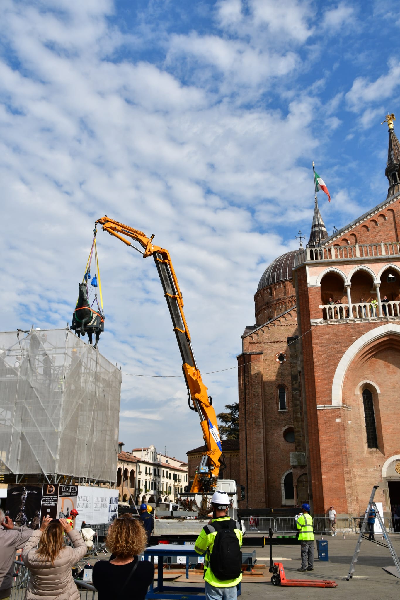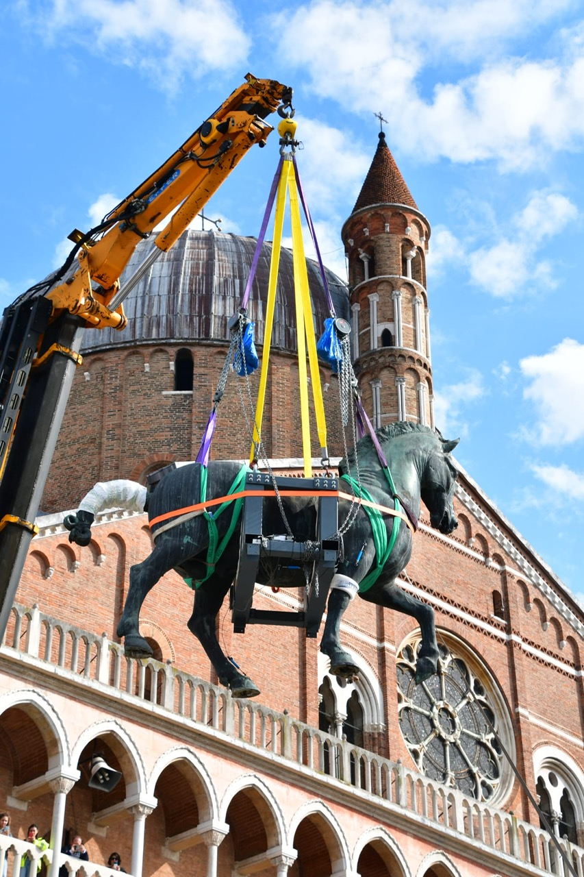 At 2:38 p.m. (Thursday, October 9, 2025), the monumental bronze horse—weighing around 1,600 kilograms—was carefully lifted from its stone pedestal in front of the Basilica of Saint Anthony. The operation, which required weeks of preparation, followed the removal of the rider, Erasmo da Narni, on Wednesday. Both sculptures are now inside the nearby former Civic Museum “Boito,” where diagnostic studies will continue ahead of the full conservation phase.