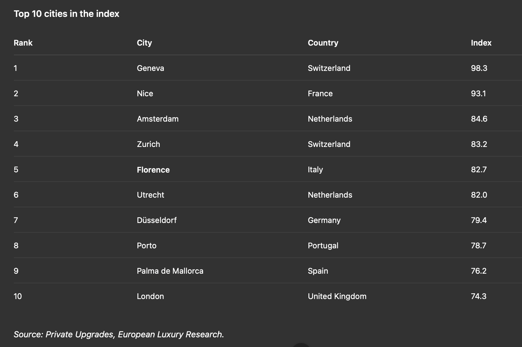 Florence’s results place it behind Geneva, Nice, Amsterdam and Zurich, and ahead of other major destinations such as Porto, Palma de Mallorca and London.