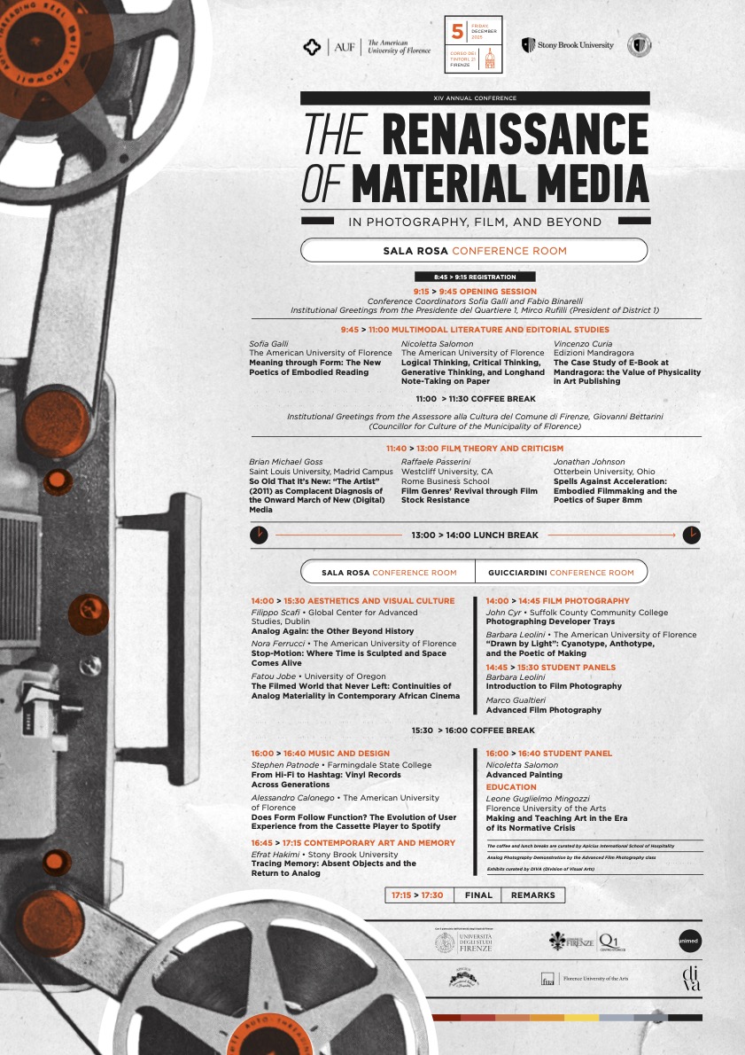 This global return to material media will be the focus of the 14th International Conference “The Renaissance of Material Media in Photography, Film, and Beyond,” organised by The American University of Florence in collaboration with Stony Brook University of New York. The event takes place on December 5, 2026, at the university’s campus in Corso dei Tintori 21 and is free to attend.