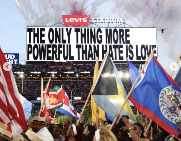 At the end of the Super Bowl halftime show 2026, as the stadium is still saturated with noise and light, a simple, almost disarming sentence appears: “The only thing more powerful than hate is love”