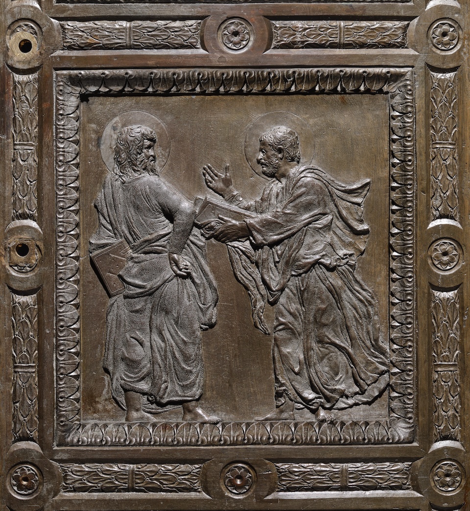 Commissioned by the Medici family, the two doors are among the most innovative examples of Donatello’s mature sculptural research. Each door consists of two leaves cast in bronze using the lost-wax technique and structured like a relief polyptych set within a projecting pietra serena architectural frame.