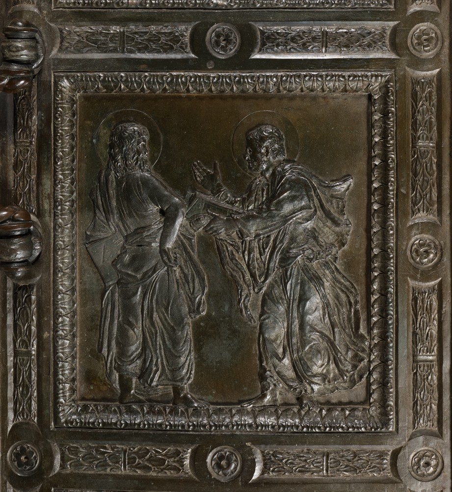 The Apostles’ Door features Saint John the Baptist, the Church Fathers and the Evangelists. Decorative friezes interrupted by rosettes frame the panels. The current handles, in the form of intertwined ropes, are not original.