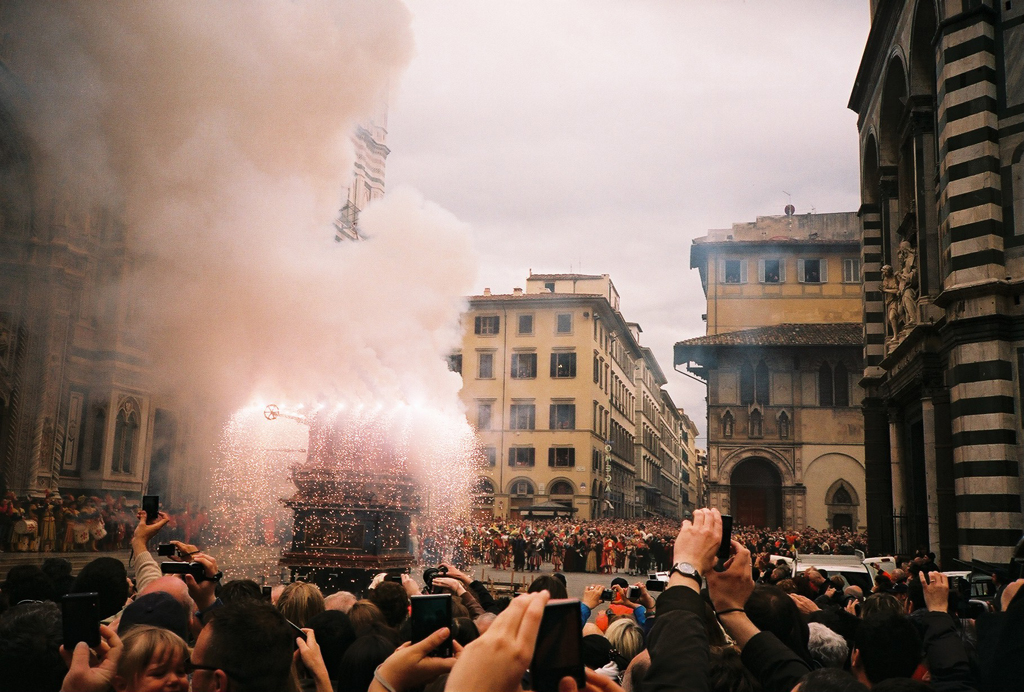 Over time, the ceremony evolved into a public event centred on a large ceremonial cart, known as the Brindellone. The current structure dates back to the 17th century. Each year, it is pulled by decorated oxen from a storage site near Porta al Prato to Piazza del Duomo, escorted by the Historical Parade of the Florentine Republic.