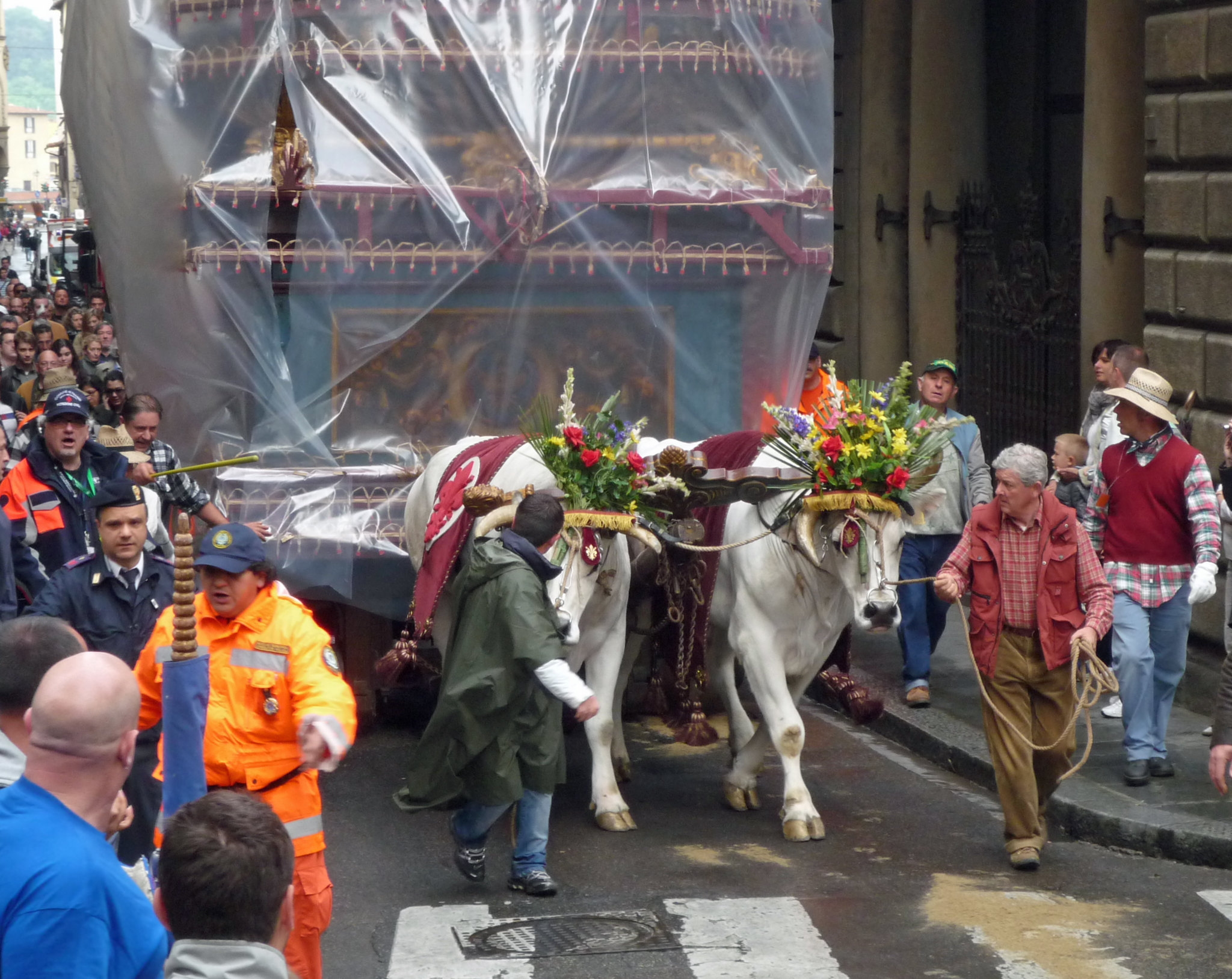 On Sunday morning, 5 April, preparations begin early. The oxen that pull the cart will depart from the Cascine park shortly after 6 a.m., while the Brindellone itself will leave its depot in Via il Prato at 7:45 a.m.