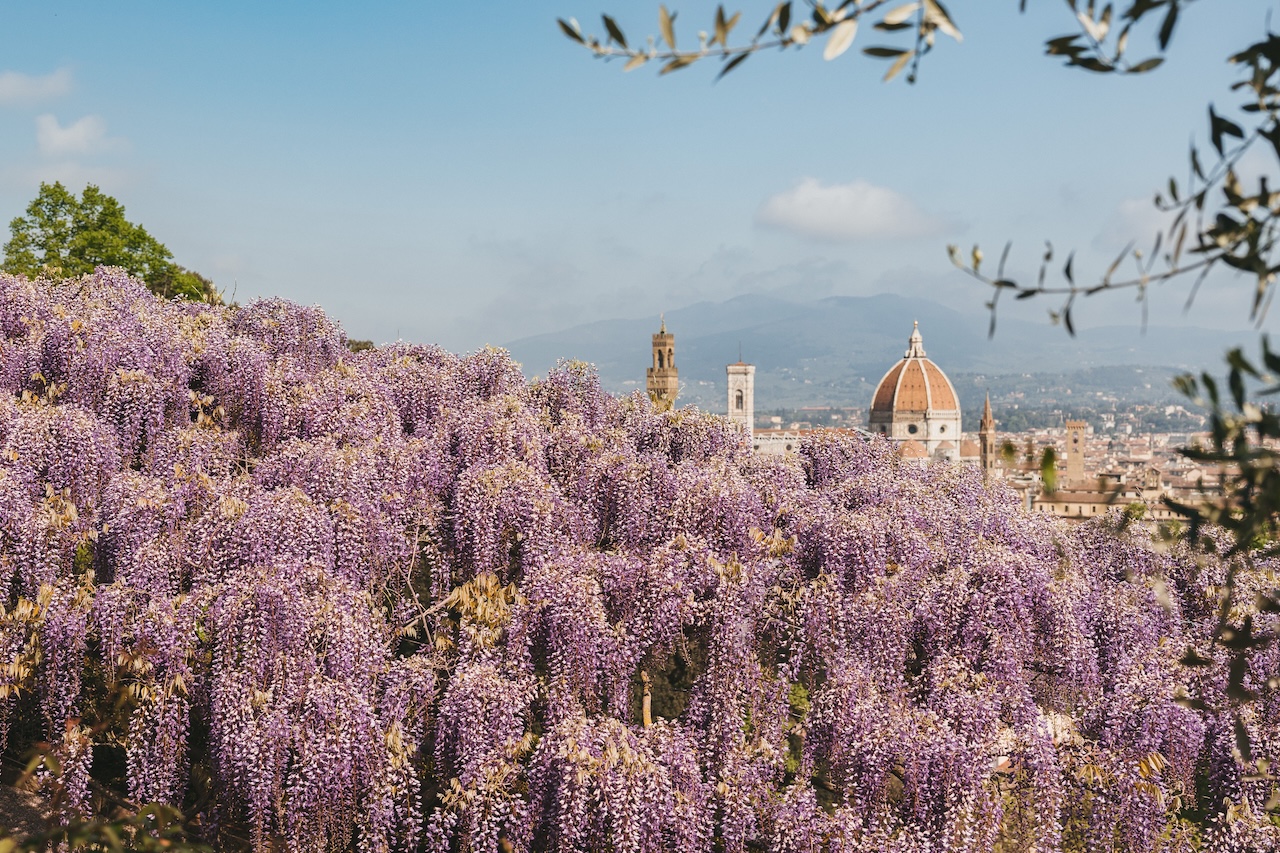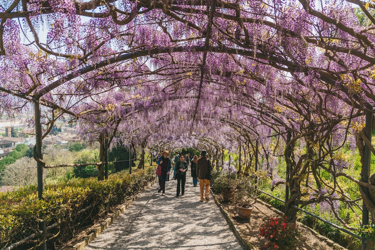 The wisteria pergola at Giardino Bardini has started to bloom, marking one of Florence’s most recognisable seasonal events. The flowering typically lasts for about ten days, offering a short window to see the tunnel at its peak.